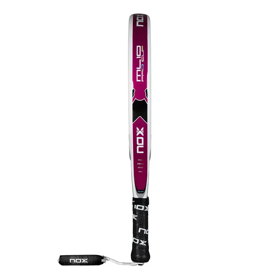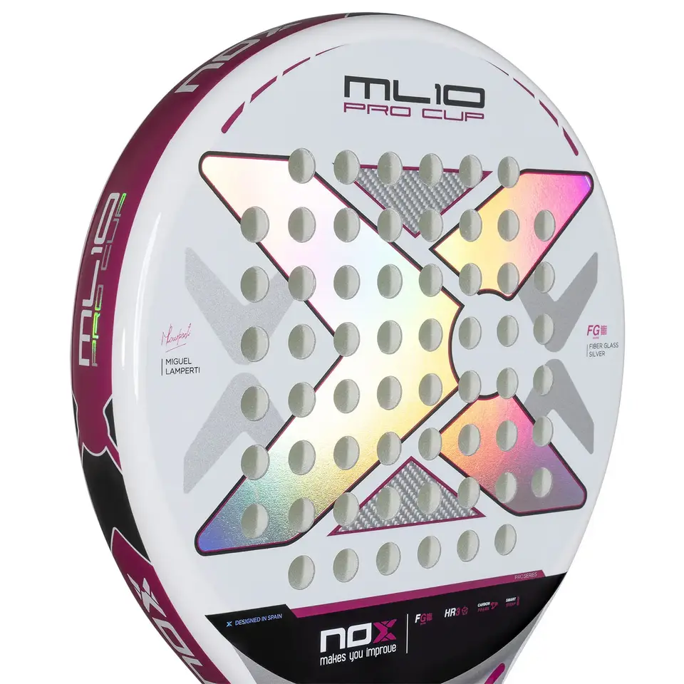 Nox ML10 Pro Cup Silver 2025 on Miguel Lampertin virallinen padelmaila – ihanteellinen valinta pelaajille, jotka etsivät täydellistä tasapainoa keveyden ja voiman välillä. Säädetty paino 360–375 g tekee tästä mallista erittäin hyvin hallittavan ja mukavan, säilyttäen samalla tälle legendaariselle sarjalle ominaisen vakauden. Pyöreä muoto takaa suuren osumapinta-alan (sweet spot), joka tarjoaa erinomaisen kontrollin jokaiseen lyöntiin. Hiilikuiturunko ja metallinhohtoisella viimeistelyllä varustettu lasikuitupinta luovat kestävän ja hyvän pallon ulostulon yhdistelmän.